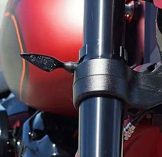 M8ソフテイル ローライダーS、FXDR114用 フロントウインカーステーです。 直径55mmのフロントフォークアウターチューブに挟み込んでマウントできます。 ウィンカーマウントはM8対応です。 多くのミニウィンカーを直接装着出来ます。 ※M5スタッドのケラーマン バレットアトーやローンバスSを取り付ける際は、M8変換アダプターが必要です。 アルミニウム製。 ブラックカラーのアルマイト仕上げ。 ステーのみ。(ウインカーは付属しません) 左右セット