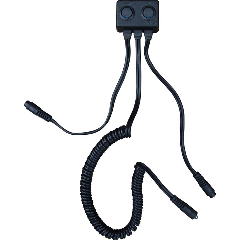 ヒーテッドギア用の2系統オン/オフスイッチ付給電ハーネスです。 コードは装着したままで気温の変化に応じて簡単にオンオフが出来るため、バッテリーの過度の消費を防ぐためにもオン/オフ切替スイッチを装備しておくと便利です。 スイッチは2個付で、ジャケット/ベストとグローブの2系統の給電を別個にオンオフ出来ます。 スイッチユニットはベルトクリップ付きですので、簡単に身に着けることが出来便利です。