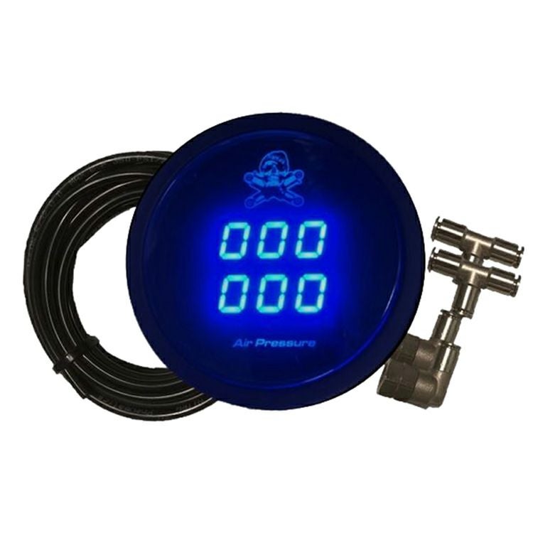 Dirty Worksのハーレー 前後エアサスキット用 エアプレッシャーゲージキットです。 ブラックのボディ。外径2-1/16インチ(約5.2cm)。 ブルーの文字で、前・後各々のエアプレッシャーを表示します。 表示範囲は0~200PSI エアチューブは5/32インチ径(Dirty Worksエアサスキット用)です。 センディングユニット、フィッティング、エアチューブが付属します。