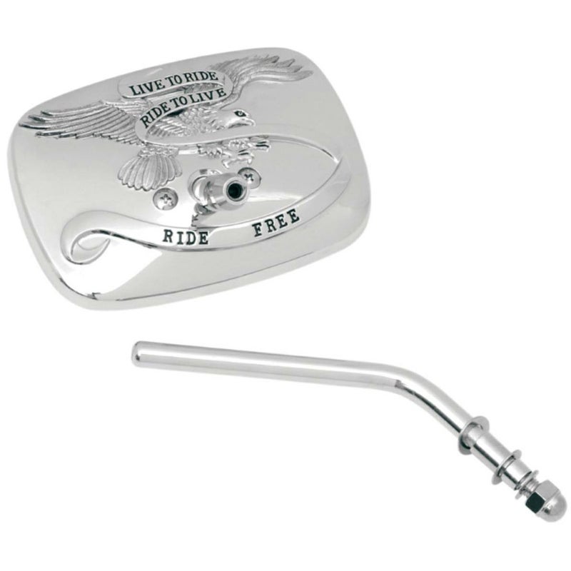 LIVE TO RIDE RIDE TO LIVE の文字とアメリカンイーグルが浮き彫りされた、ゴージャスなミラー。 アメリカンクルーザーにベストマッチします。 ハウジングはアルミダイキャスト製。 貫通式のミラーマウントに挿し込んで付属のコーンナットで締めこんで装着します。 右用 単品販売