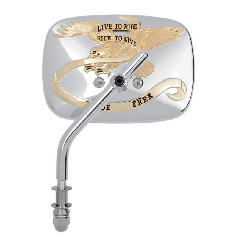 LIVE TO RIDE RIDE TO LIVE の文字とアメリカンイーグルが浮き彫りされた、ゴージャスなミラー。 アメリカンクルーザーにベストマッチします。 ハウジングはアルミダイキャスト製。 クロームのベースに浮き彫り部分はゴールドのゴージャスな組み合わせ。 貫通式のミラーマウントに挿し込んで付属のコーンナットで締めこんで装着します。 右用 単品販売