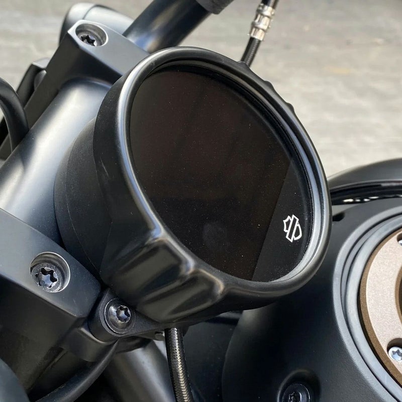 スポーツスターS用 メーターカバーです。 スピードメータに被せるだけで、のっぺりとしたスピードメーター周りを、ダークでスペシャルなルックスにドレスアップします。 両サイドのリブ付きウィングがデザインアクセントです。