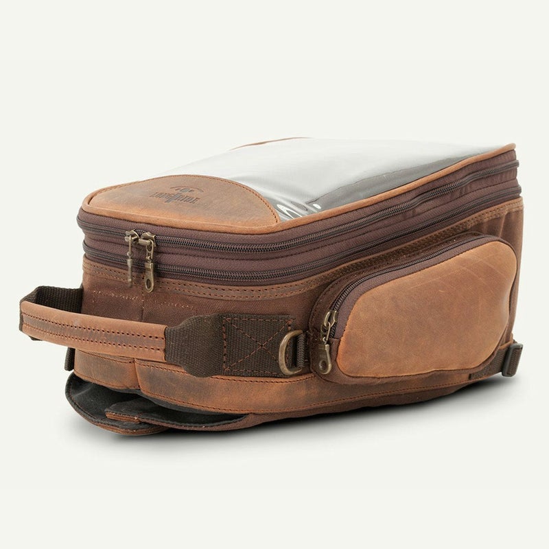 容量拡張可能なワックスコットンキャンバス製タンクバッグです。 <特長> ●両サイドのマグネット内蔵フラップで、タンクに簡単着脱 ●防水ワックスコットンキャンバスとベジタブルタンニンなめしレザーの組み合わせ。使い込むほどに味わい深いを増します ●トップポケットは地図やスマホの収納に便利な、タッチスクリーン対応透明カバー付 ●ジッパーの開閉で荷室の高さを調整可能。容量約9.5L~14.5L ●両サイドはサングラス等の小物の収納に便利なジッパーポケット付き ●脱落防止用セーフティーストラップ内蔵 ●レインカバー内蔵 ●持ち運びに便利なハンドル付 ●ショルダーストラップ装着用のDリング付 ※アルミタンクなど、スチールタンク以外には装着出来ません。 ※タンクの形状により装着出来ない場合があります。 ※ショルダーストラップ(970952、970953)は別売です。 ※写真は他のカラーのものを含む