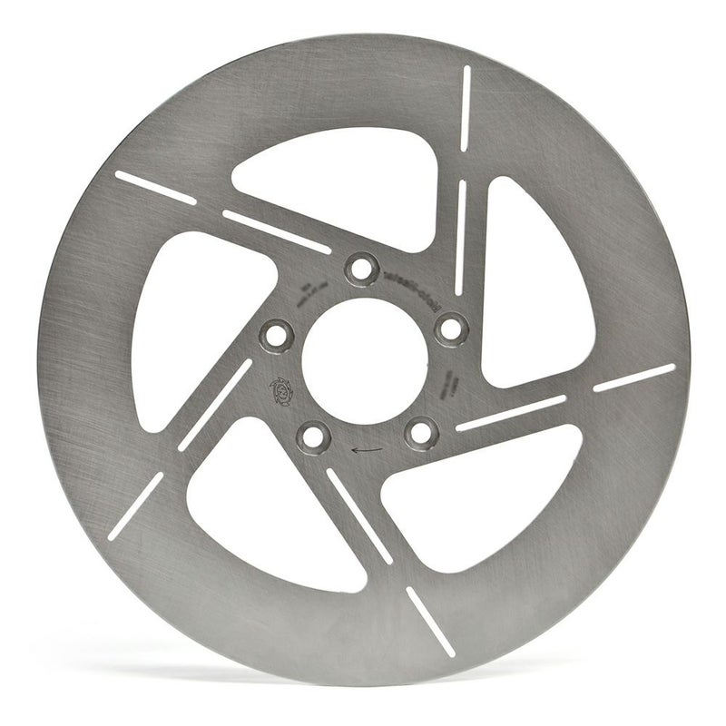 ハーレー Vロッド用 スポークマウント式 リアブレーキローターです。 5インチボルトサークルのセンターハブマウント方式です。 センターから斜めに伸びるストレートスポークのTULSA(タルサ)デザイン。 躍動感を演出します。 高品質ステンレススチール製。 CNCマシンによるレーザーカット加工で製作された精度の高い製品で、ブレや振動を発生しません。 ヨーロッパの安全認証機関(TUV)認証品。 ※写真は実物と細部が異なります。(参考写真)