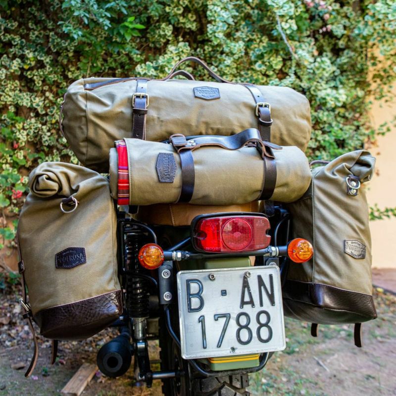 スペインのメーカー PODEROSA(ポデローザ)は、モーターサイクル・ツーリストのニーズから生まれた、バッグを中心とした武骨な製品が特長です。コットンキャンバスと本革ストラップの素材を用いたクラシックデザインと、クイックリリース機構による現代的な使い勝手の良さを両立させています。