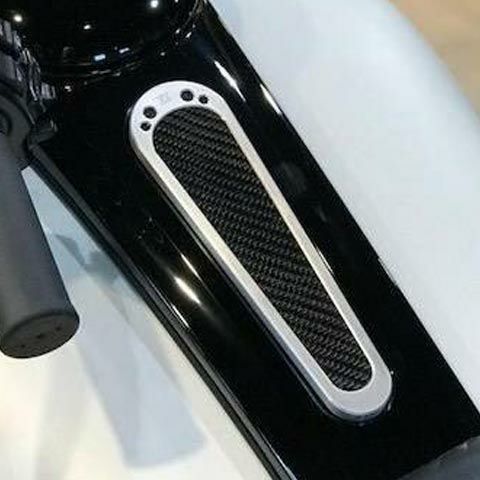 タンクコンソール パネルです。 本体の素材は航空機部品グレードのアルミニウム製。 ナチュラル・ブラシ仕上げの本体と、カーボンファイバーのインレイの組み合わせです。 インレイは取り外し可能です。 同デザインのフューエルドアやマスターシリンダーカバーと組み合わせれば、より完璧なカスタムルックに仕上がります。