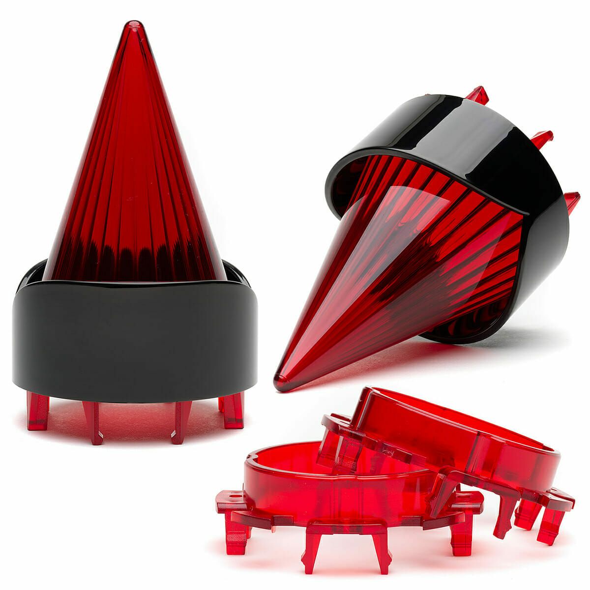 攻撃的で、ジェットエンジンのアフターバーナーのようなデザインのウインカーレンズ。 また昔のアメ車を連想させる形状で、オールドスタイルカスタムによく似合うデザインです。 標準装備のフラットウインカーのレンズと交換して取り付けます。 ※取り付けの際は、ベゼル部分ではなくレンズ部分を持って取り付けてください。