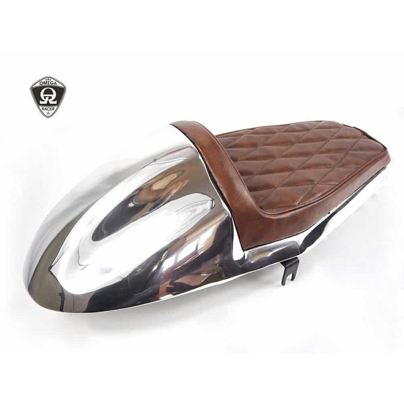 1993~2003 スポーツスター用 アルミシートカウルとシートのセットです。 <特長> ●テールの両サイドに窪みを設けたデザイン ●カウル部分は厚さ3mmの軽量かつ頑丈なアルミニウム製。ポリッシュ仕上げです ●シートはダイアモンドステッチ入りのアグレッシブなイメージ ●OMEGA RACER(オメガレーサー)のアルミタンク(Mugello、Road Racer、Norton)と組み合わせると、完璧なカフェレーサースタイルに仕上がります ※ブラシ仕上げも同価格でオーダー可能です(詳細はお問い合わせください)