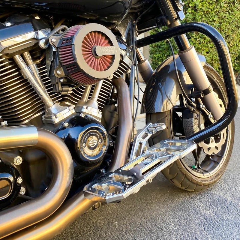 ハーレー ツーリング、FLソフテイル用 ライダーフットボードです。 6061ビレットアルミニウム製。CNCマシンによる削り出し加工品です。 クロームフィニッシュ。 薄型のすっきりとしたデザインです。 表面はBMXスタイルのトラクションピンが配置されています。 左右ペア