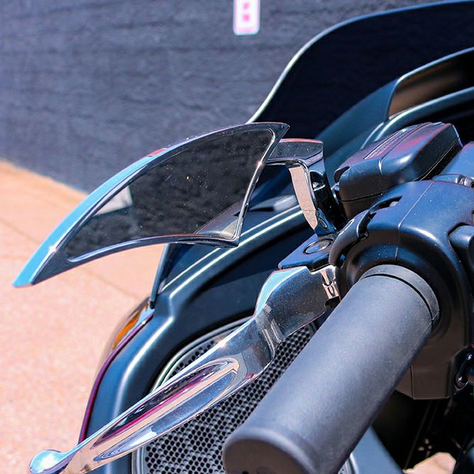 ハーレー用 カスタムミラーセットです。 くさび型シェイプのアグレッシブなデザイン。 1999年のアメリカ・オークランドのバイクショーでチャンピオンとなったポールヤフィーのカスタムバイクで使用されたデザインです。 ボディは6061-T6アルミニウム製の削り出し加工品。 クローム仕上げ。 取付け用のハードウェアが付属します。 左右セット。