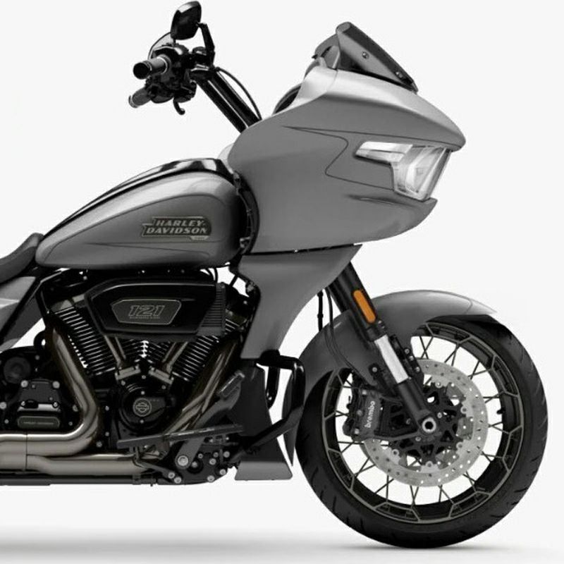 CVO ロードグライド、CVO ストリートグライド用 スチール製フロントフェンダーです。 ショートタイプのCAFE(カフェ)スタイルで、フロント周りをスポーティーにドレスアップします。 14ゲージ(約1.6mm)厚のスチール鋼板をプレス加工で成形し、レーザーカット加工で仕上げてあります。 溶接部分の無い一体構造のため、頑丈です。 2023以降 CVO ロードグライド、CVO ストリートグライドのノーマル19インチホイールにマッチします。 倒立フォーク用のアダプター(ブラック)が付属します。 未塗装品。 好みのカラーにペイントしてください。 ※車両装着写真は塗装例です。(参考写真) 取付け用のボルトが付属します。