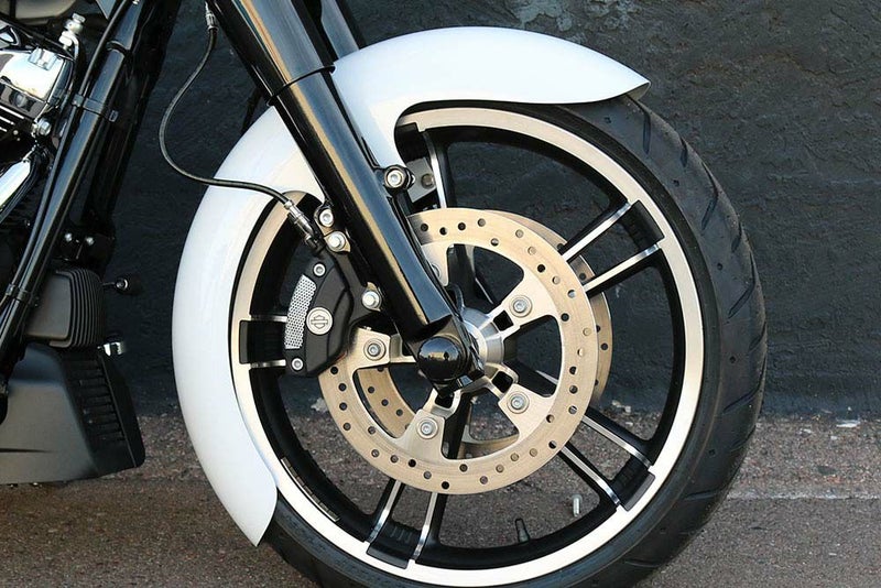 クラシカルな、ウェストコーストスタイルのフロントフェンダーです。 バガースタイルにベストマッチなデザインです。 付属のマウント用ブラケットカラーはブラックです。 21インチホイール用のサイズです。 21インチホイールとタイヤを包み込むシェイプです。 頑丈な14ゲージスチールの一枚板を特殊な金型を用いたプレス加工とレーザーカットで製造されていますので、溶接痕や継ぎ目等が無く、スムースな仕上がりです。 取付けボルト用の穴も開けてあります。 下地塗装は電着処理されていますので、錆や腐食に大変強くなっています。 未塗装品ですので、塗装は別途必要です。