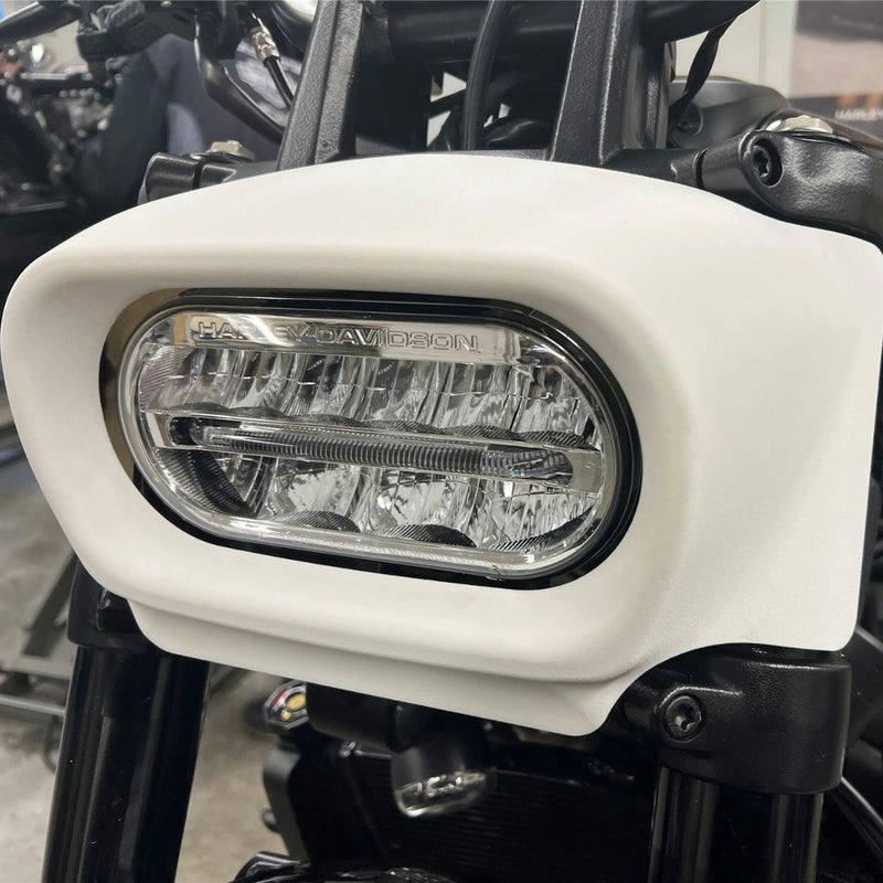 ハーレー スポーツスターS用 ヘッドライトカバーです。 オーバルシェイプのノーマルヘッドライトに合わせたカットアウト仕様です。 ヘッドライト周りをカバーすることで、ファットなフロント周りにマッチしたカスタムルックスにドレスアップします。 ※フロントウィンカーは移設が必要です。 素材は軽量かつ頑丈なグラスファイバー。 未塗装品。好みのカラーにペイントしてください。 取付けに必要なブラケット、ハードウェアが付属します。