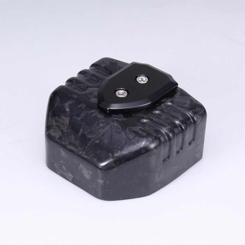 スポーツスターS、パンアメリカ用 ドライカーボン製イグニッションコイルカバーです。 <特長> ●最新のカーボン加工技術である、ドライカーボン製法による本格的カーボンパーツ。航空機部品にも使用される超軽量・超高強度を誇る素材です ●本物のカーボンパーツが持つ高級感溢れる質感。イグニッションコイルに被せることで抜群のドレスアップ効果を発揮します ●マーブル調のフォージドカーボン柄。一品ずつ微妙に異なる柄を楽しめます。艶あり仕上げです ●紫外線に強いUVカット加工済み ●ブラックのアルマイト仕上げアルミ製プレート付。高級感が更にアップします ※車両装着写真は綾織りカーボン柄のものです。(参考写真)