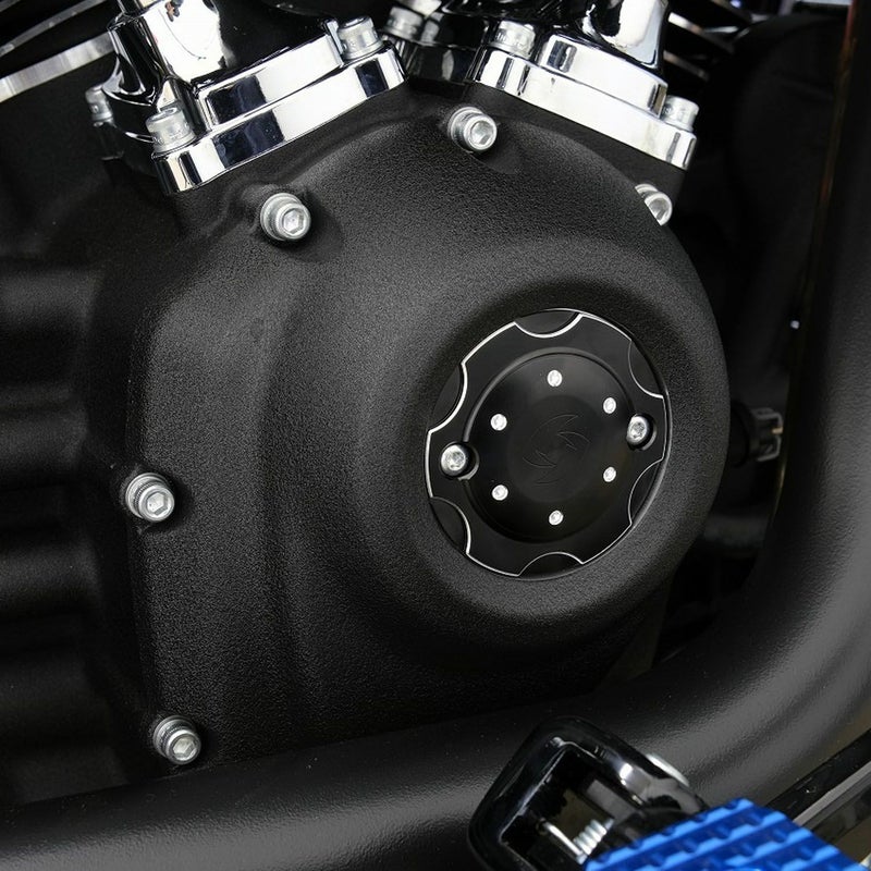 M8ソフテイル用 アルミ二ウム製ダービーカバーです。 <特長> ●周辺部分のギア調の切り欠き模様とドットがメカニカルな雰囲気。プライマリー周りをドレスアップします ●ブラックのベースにエッジとドット部分がシルバーのコントラストカラー ●センターにはSPEEDRA(スピードラ)のロゴマークが浮き彫りされています ●高強度アルミ二ウム合金(A6061-T6)製。ビレットからの削り出し加工により製作されています。変色、腐食、キズに強いアルマイト仕上げ