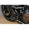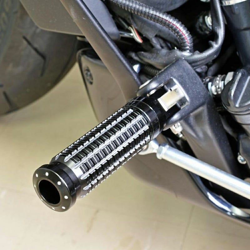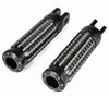 スポーツスターS、ナイトスター/S、M8ソフテイル用 ライダーポジション・フットペグです。 高強度アルミ合金A6061-T6を削り出し加工しています。 滑り止め模様とエンド部分のドット模様が精緻に加工された凝ったデザイン。 ブラックのベースに切削部分はシルバーのコントラストカラー。変色や腐食に強く、耐摩耗性を向上するアルマイト処理済みです。 左右ペア