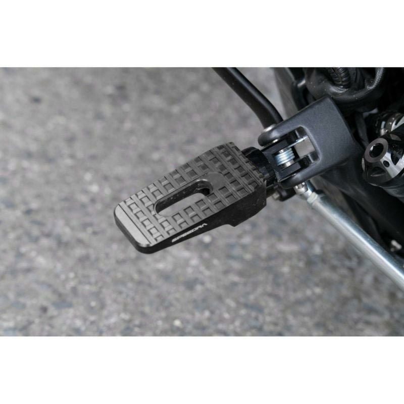 スポーツスターS、ナイトスター、M8 ソフテイル用 ライダーフットペグです。 <特長> ●高強度アルミニウムA6061-T6を使用。削り出し加工による質感の高い仕上がりです ●アルマイト処理により変色や腐食を防ぎ、耐摩耗性を向上 ●表面の滑り止めパターンとセンターの肉抜きがデザインアクセント ●裏面は斜めのカットで軽量化とバンク角を確保 ●マウント角度調整可 ●左右ペア ※車両装着写真はレッドカラーのものです。(参考写真)