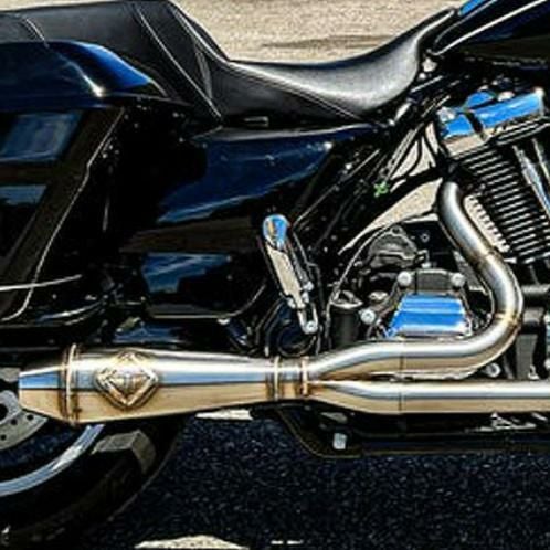 M8ツーリング用 2-1フルエキゾーストマフラーです。 <特長> ●4.5インチ(最大)径の太径・リバースコーンタイプのマフラーボディがスポーティーかつ迫力あるルックスです ●ステンレスブラシ仕上げ。TIG溶接痕がスポーティーな雰囲気です ●2.25インチ~2.5インチに径を増すバッフル内蔵。低~中回転域でのトルクアップ、パワーアップします ●0.065インチ(約1.65mm)厚のステンレスパイプ製。1-3/4インチ~1-7/8インチ径へ径を増し、2インチ径の集合部分へ繋がることで、排気をスムースに流し、排気効率がアップします ●12mm/18mm O2センサー対応 ●取付けに必要なハードウェアが付属