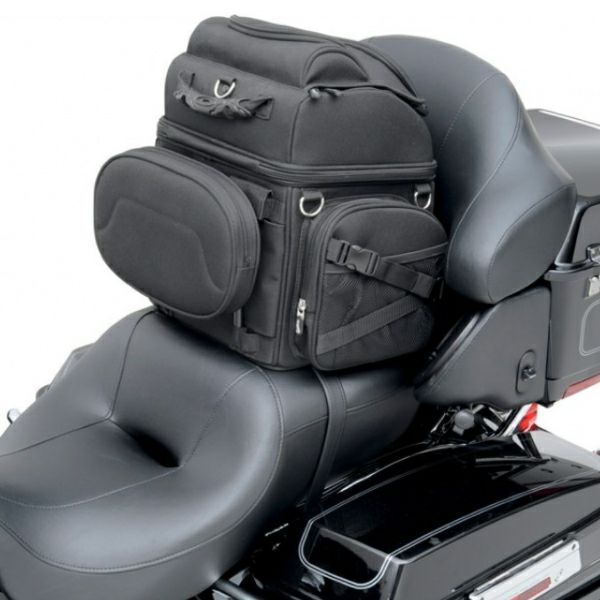 シーシーバーやリアシート、ラゲッジラックへ装着するタイプのツーリングバッグです。 シートおよびシーシーバーへの装着用ストラップ付です。 背面にはショルダーストラップ内蔵。バックパックとして背負うことが出来ます。 丈夫な1200デニールの耐UV、耐水素材とビニールレザーです。 中身が空の状態でも型崩れしません。 メインコンパートメントは上下に分かれており、荷物の整理収納に便利です。 トップコンパートメントには3/4サイズのヘルメットを収納可能です。 前面のポケットは小物類やメモ、ペンなどの収納に便利な仕様です。 トップフラップにジャケット類を挟むことも出来ます。 ミニパドロック付きで、ジッパーをロックできます。 レインカバー付。