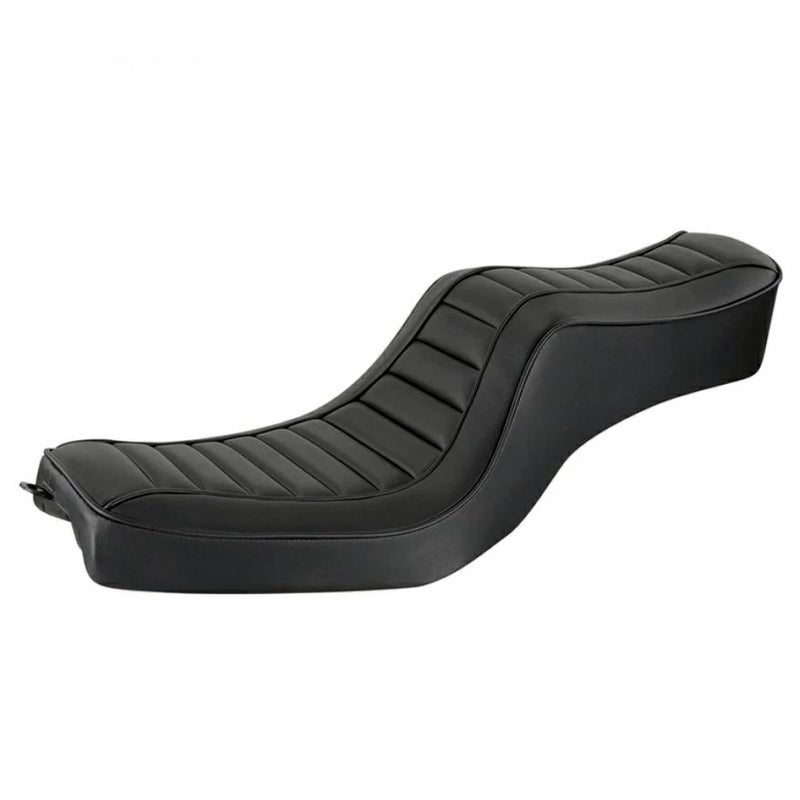 カリフォルニアのカスタムショップ、Hog Killers のデザインによる、カスタムシートです。 オールドチョッパー風の、スリムでフレームに沿ったシルエットですが、中身はサドルマンによる最新素材が盛り込まれています。 シートフォームはサドルマン独自のウルトラフォーム。水分を吸収しずらく、高い耐久性を誇ります。更にライダーおよびパッセンジャー側にゲルを内蔵しており、長時間のライディングでも衝撃や振動からライダーを守ります。 座面センターにはビンテージ調のプリーツステッチ入り。周囲のパイピングと共にアクセントになっています。