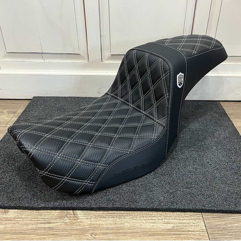 2006~2017 ダイナ用 2UPシートです。 クラブスタイルで人気のSan Diego Customs(サンディエゴカスタムズ)と、品質と快適性でハーレーライダーからの評価の高いSaddlemen(サドルマン)のコラボレーションシート。 両サイドにはSDC(サンディエゴカスタムズ)のロゴエンブレム付。 高く切り立ったライダーバックサポートが激しいライディング時にも確実にライダーの身体をサポートします。 更に座面には滑りにくいグリッパー素材を使用。 座面ステッチはラティス(格子柄)ステッチ入り。 ライダー座面にはゲル入りで、長時間の乗車も快適です。 ※リアサスペンションのアッパーボルトカバーはシートと干渉するため、取り外してください。