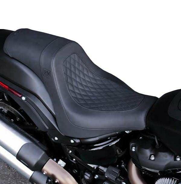 ハーレー M8ソフテイル ローライダー(S)、ローライダーST、スポーツグライド用 2UPシートです。 南カリフォルニアのパーツショップ、Speed Merchant(スピードマーチャント)のデザインで、サドルマンが制作したコラボレーションシートです。 バックサポートが高く、幅のスリムな、スポーティーなシェイプ。 ライダー座面のパネルには格子柄ステッチ入り。 サイドにはSM(Speed Merchant)のロゴ、テールにはサドルマンのロゴマークが入っています。 シートフォームはサドルマンオリジナルの高密度シートフォームULTRAフォームと、更にライダー側にはゲル入りですので、長時間のライディングでも快適に過せます。 表皮はサドルマンオリジナルのSaddlehide(サドルハイド)。本革のような質感のビニールレザーです。