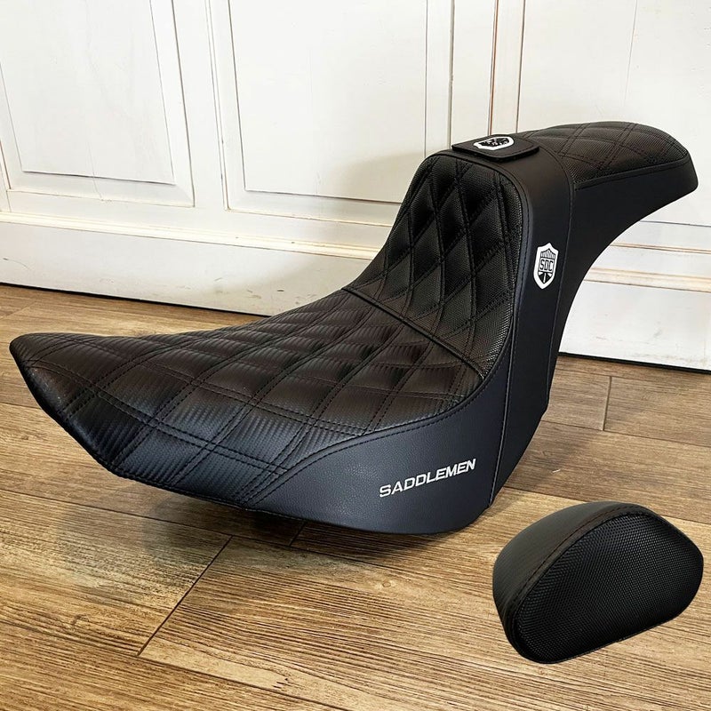 M8ソフテイル ローライダー/S/ST、スポーツグライド用 2UPシートです。 クラブスタイルで人気のSan Diego Customs(サンディエゴカスタムズ)と、品質と快適性でハーレーライダーからの評価の高いSaddlemen(サドルマン)のコラボレーションシート。 両サイドにはSDC(サンディエゴカスタムズ)のロゴエンブレム付。 高く切り立ったライダーバックサポートが激しいライディング時にも確実にライダーの身体をサポートします。 更に座面には滑りにくいグリッパー素材を使用。 座面ステッチはラティス(格子柄)ステッチ入り。 ライダー座面にはゲル入りで、長時間の乗車も快適です。 ライダーバックレスト付ですので、長時間の乗車時にライダーの背中への負担を軽減します。