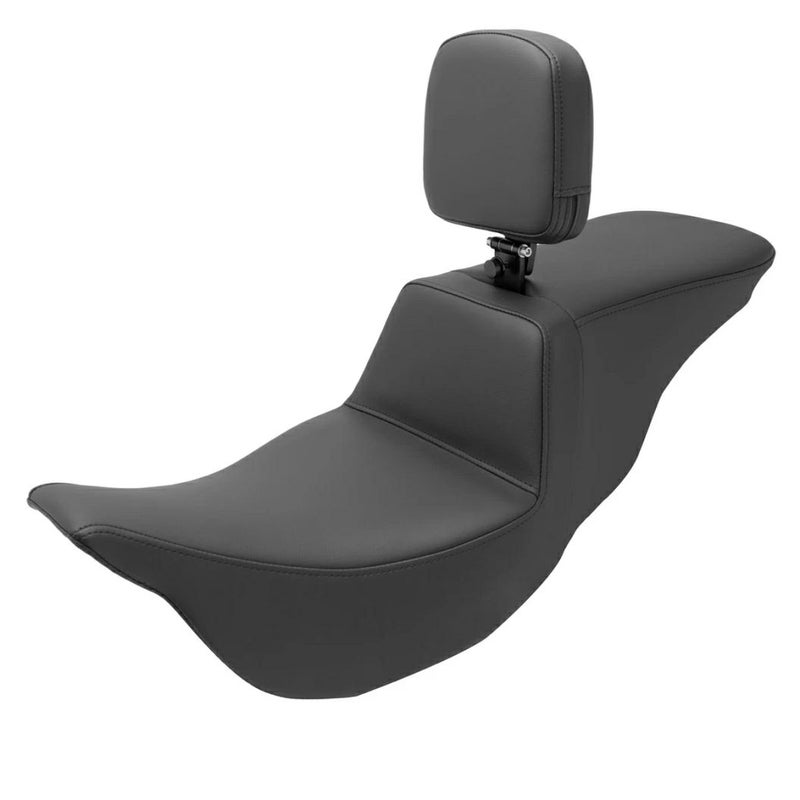 SaddleMen製ツアー ステップアップ シートです。 バックレスト付きのプレーン・シートです。 バックサポートが大きく切り立ったステップアップシートをベースに、パッセンジャーの座面を広くすることでタンデム乗車の快適性を高めているのが特徴です。 シートフォームはサドルマン独自のゲル一体成型のウルトラフォーム。 長時間乗車でも体重を適度に分散し続け、お尻が痛くなりません。 表皮はまるで本革のような風合いのサドルハイド・ビニールレザー。 バックレスト付なので、ロングツーリングでも快適です。