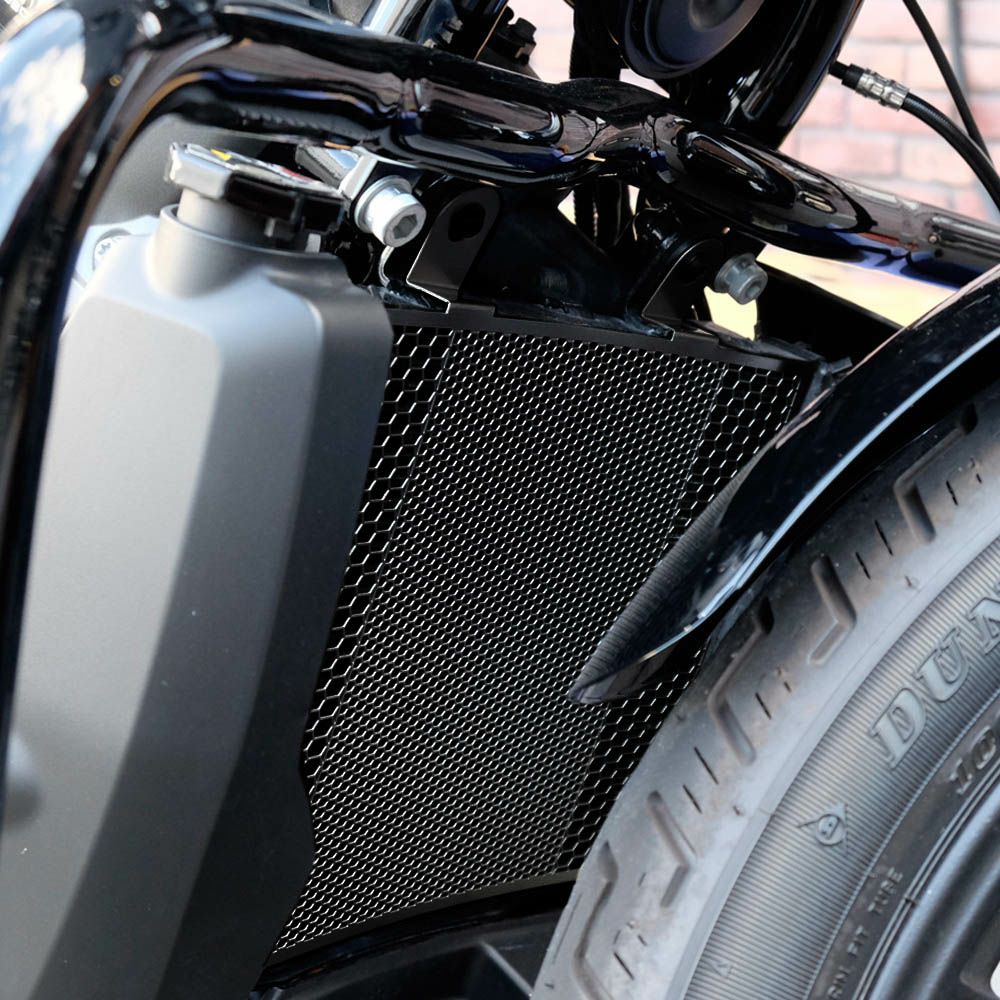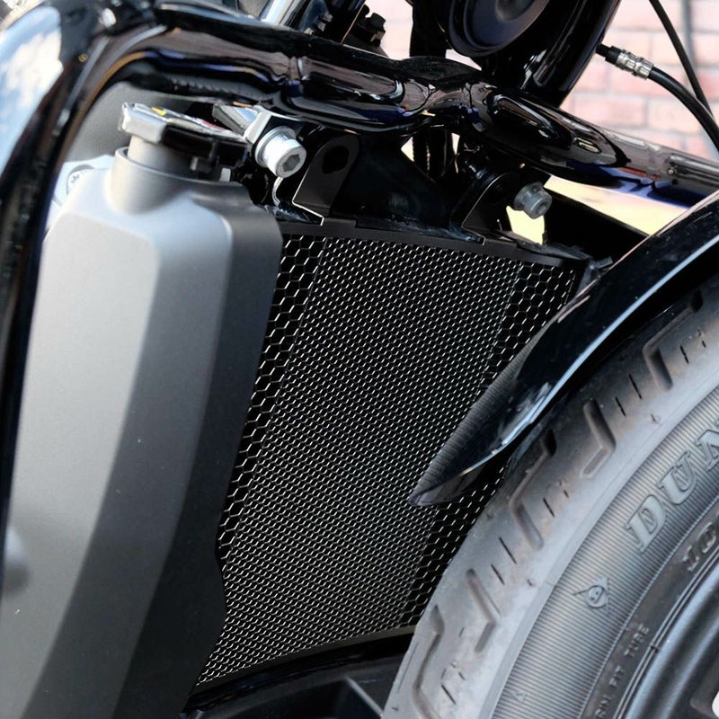 ナイトスター(RH975)のラジエターコアを保護すると同時に、見た目のドレスアップ効果もあるステンレス製のガードです。 ラジエターを保護しつつ冷却性能を落とさない独特なメッシュ形状です。 比較的傷つきやすいフロントタイヤの後方部分は、メッシュを細かくし、それ以外の場所はメッシュを大きくし空気の流れを阻害しないようになっています。 ※取り付けはラジエター底部にガードの突起を引っ掛け上部2箇所をボルトで固定するだけなので簡単です。 ※ラジエターコアガードは平面状の部品ですが上部の2箇所を締め上げていくとラジエターコアガード本体に沿う湾曲した形状になります。