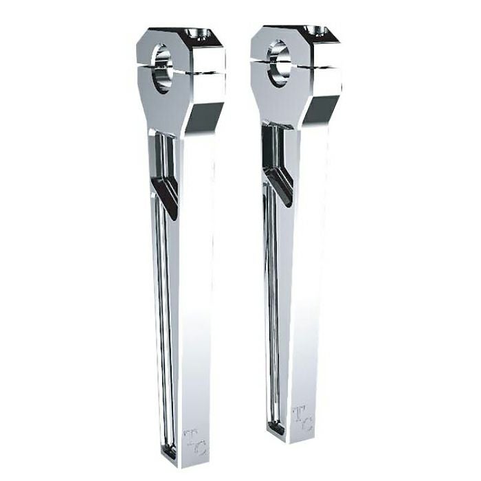 ハーレー用 ストレートライザーです。 分厚いトップと、テーパーするボトムの組み合わせが荘厳で力強い雰囲気です。 1インチ径ハンドルクランプ仕様です。 多くのハーレー用ハンドルを装着出来ます。 高さは10インチ(約25.4cm) ビレットアルミニウム製。 クロームフィニッシュ。 トップクランプとライザー本体にTodds Cycle(トッズサイクル)のロゴ入りです。 ライザーボルトは多くのハーレーで使用されている1/2-13サイズを使用します。 ※ライザーボルトは付属しません。