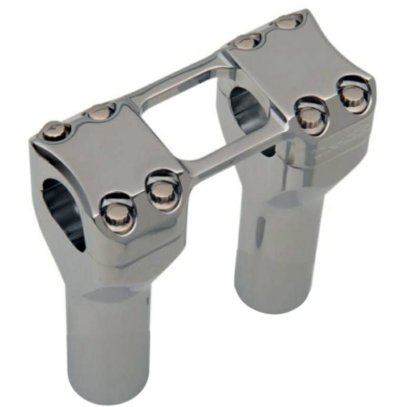 ハーレー用 ストレートライザーです。 ライザーボルトセンター間3.5インチ(約8.9cm)。多くのハーレーのトリプルツリーにマッチします。 軽量かつ丈夫なビレットアルミニウム製。CNCマシンによる削り出し加工品です。 トップクランプは左右ライザーを2本のブリッジで繋ぐデザイン。 クランプボルトが付属します。 ゴージャスなクロームフィニッシュです。 クランプ部は1.25インチ径