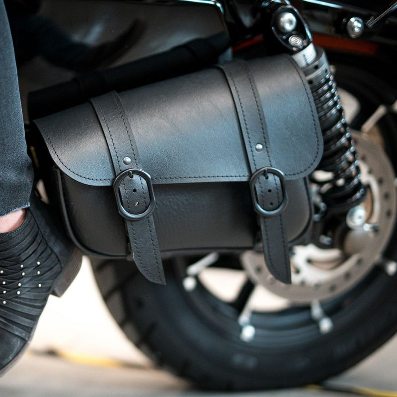 スポーツスターに最適な、丈夫で手入れの簡単なシンセティックレザーのスイングアームバッグです。 <特長> ●ビンテージテイストのミニマルなスイングアームバッグ ●やや横長なシェイプで、スポーティーなルックスと同時に4Lの容量を確保 ●丈夫なシンセティックレザー製。手入れが簡単で実用的 ●ブラックの表皮と、リッドストラップのバックルもブラックのクールなカラー ●リッドストラップはクイックバックル式で簡単に開閉可能 ●マグネット式の内蓋付きで確実に荷物を保持できます ●バックパネルは型崩れしにくいABS樹脂製 ●付属のレザーストラップで3か所に固定