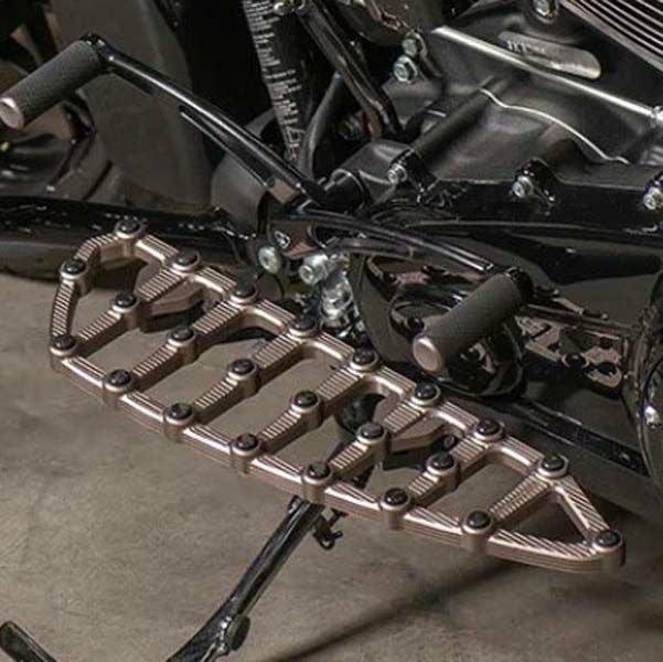 ツーリング、トライク、FLソフテイル、ダイナスイッチバック用 ライダーフットボードです。 モトクロススタイルのアグレッシブなデザイン。 本体はビレットアルミニウム製。大胆に肉抜きされた造形に加え、上面と側面に精緻な溝が刻まれています。 チタンカラー。腐食に強いアルマイト仕上げです。 ブラックアウトされたカスタム、クロームパーツ共にマッチします。 滑り止めのラバーインサートによりステップへの荷重を確実に受け止めます。 同デザインのパッセンジャー フロアボード(06-876)やフットペグ(400-006)と組み合わせて統一感を楽しむことも出来ます。 ボード本体のみ。 左右ペア