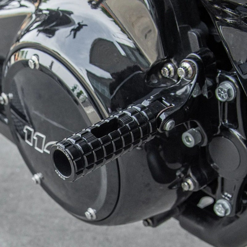 M8 ソフテイルおよびRevolution Max搭載車(スポーツスターS、ナイトスター RH975、パンアメリカ)用 パッセンジャーフットペグです。 長さは短めです。 ビレットアルミ二ウム製。 カラーはブラック。 軽量化のため、中空になっています。 表面は滑り止めのナールパターン。 センター部分はカットアウトされており、より確実なグリップと、アグレッシブなルックスを両立しています。