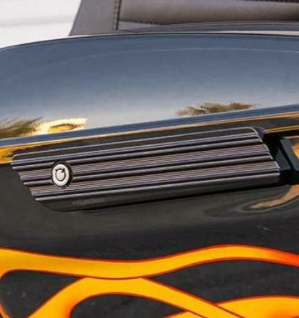 10ゲージデザインの、サドルバッグラッチカバーです。 横方向の大きな溝と凹み部分の細かい溝が特徴です。 ビレットアルミニウム製。CNCマシン削り出し品です。 ブラックアノダイズフィニッシュ。 左右ペア