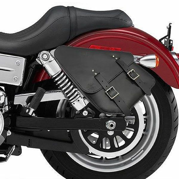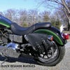 本革製スランティングスタイルのサドルバッグ。 リアサスペンションの横にピッタリフィットし、バッグ全体が斜めに傾いた個性的な形状です。 標準装備のリアウインカーを避ける形状なのでウインカーの移設等の必要がありません。 BAD&G CUSTOMはアメリカでレザー製品のカスタムを主に行うショップです。 受注生産なので、バックルカラーやステッチカラー等の選択が出来、自分好みに仕上げる事が可能。 また、オプションのクイックリリースバックルを追加する事で、見た目はそのままに開閉が楽になります。 バックルカラーは、クローム、ブラス(真鍮)、ブラックから選択可能。 ステッチカラーは写真の14色より選択可能。