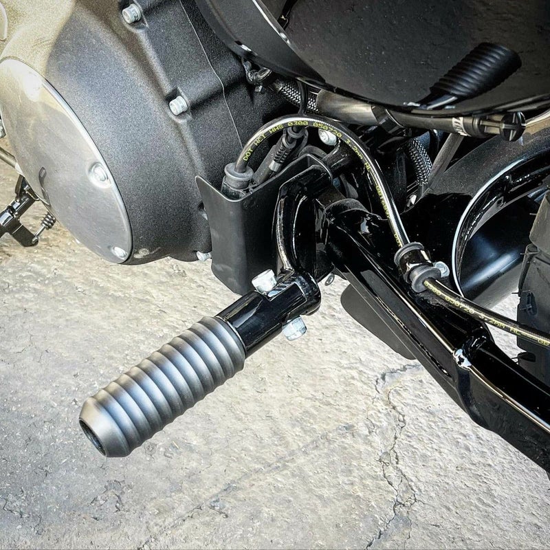 ハーレー スポーツスターのパッセンジャーペグの位置に装着する、スライダーです。 通常のペグマウントと異なり、ペグが折りたためない形状になっており、パッセンジャーフットペグの代わりに装着すれば、転倒時にはスライダーの役割を果たします。 通常のタンデム走行ではタンデムステップとしても使えます。 スライダー部分は摩擦に強いデルリン製、交換可能です。 大きな溝のついたGrippleデザイン。 左右ペア