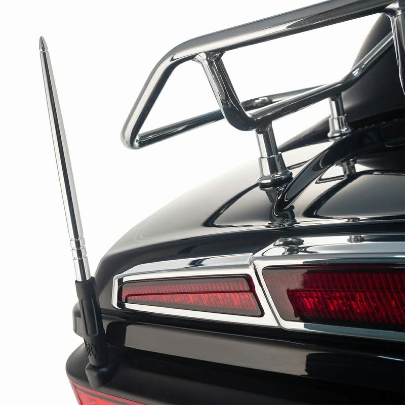 ハーレー ツーリング、トライグライド用ラジオアンテナです。 精悍なルックスの銃弾型シェイプ。標準装着のホイップアンテナと交換すれば、愛車を更にドレスアップします。 本体は6061アルミニウム製。ゴージャスなクロームフィニッシュ。 ラバー製のベース付でフレキシブルに可動します。 AM/FM/WBラジオ対応。 ※CB無線は非対応 ハーレー純正のアンテナマウントへ装着出来ます。 ※M6-1.0x30mmのスタッドボルトも付属します。(インディアン装着用)