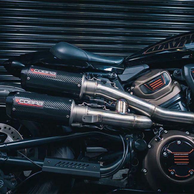 スポーツスターS用 ハーフエキゾーストパイプとマフラーのキットです。 マシンを操るライダーの満足度向上を念頭に開発され、エンジンパフォーマンスの向上、軽量化によるハンドリングの向上および、レーシーなルックスを備えています。 エンジンに火を入れた瞬間から感じるパワフルなエキゾーストサウンドを堪能できます。 マフラーボディはカーボンファイバーの外装を持つ2本出し。 ミッドエキゾーストパイプは連結パイプ付き。中低速域のトルクを確保しています。 O2センサー取付け用の穴があります。 ノーマルヒートシールド装着可。 脱着可能な消音バッフル付(エキパイとマフラーの連結部) 排気音量: ノーマル99.7db、消音バッフル無116db、消音バッフルあり112.5db Cobra Sport(コブラスポーツ)は高級ステンレススチール製品で世界的に有名なイングランド・シェフィールドのレーシングエキゾーストメーカーです。1968年の創業以来ハイパフォーマンス、ハイクオリティの製品を作り続けており、同社の製品は世界に誇る工業製品の証である、Made in Shefield(メイドインシェフィールド)の称号を得ています。