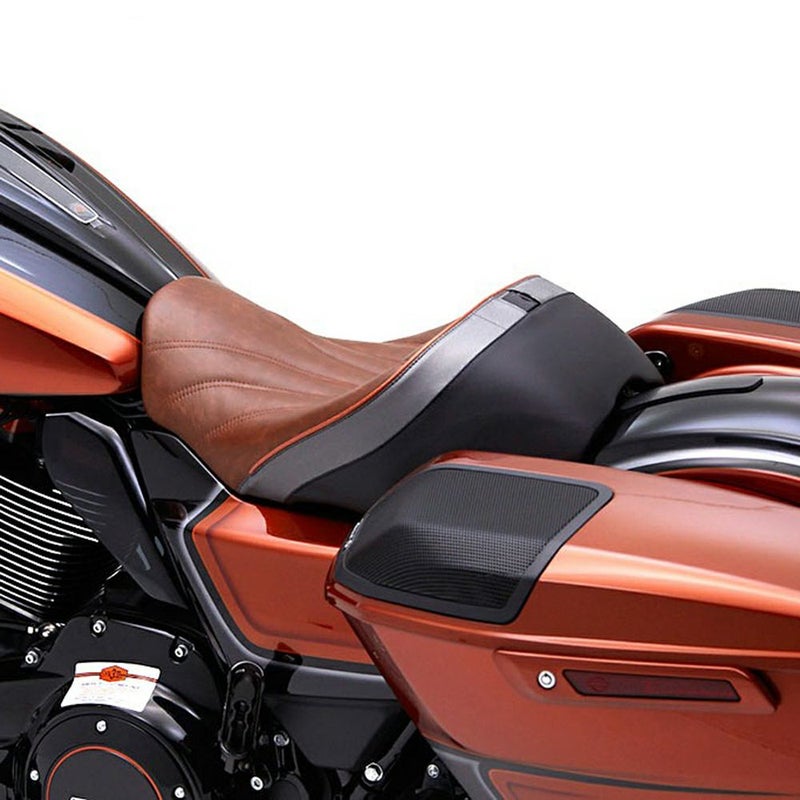 2023年以降 CVOロードグライド、CVOストリートグライドおよび2024以降 ロードグライド、ストリートグライド、CVOロードグライドST用 クロースタイプ・ソロシートです。座る位置が前寄りになり、ハンドルやフットペダルが近くなります。 <特長> ●新型CVOの独特なタンク~サイドカバーにかけてのラインにマッチするシェイプ ●クラシカルなサドルスタイル。ライダーの腰を包み込む座面形状で長距離ツーリングで抜群のサポート力を発揮 ●着座位置が前寄りになり、ハンドルやフットレバーの操作が楽になります ●コルビンオリジナルの高密度シートフォームと頑丈な専用シートベースでライダーの体重を常に適度に分散し、長時間の乗車でも快適 ●キーロック機構付き。付属のブラケットを車体に取り付けるだけであとはキー一本で着脱可能 ●別売コルビン専用バックレスト(BR、02-SB 他)を装着可能 ●別売専用ピリオンシートとの同時装着可能 ●純正デタッチャブルラックと専用ピリオンシートの同時装着も可能 ※写真のバックレスト(BR)は別売です。 ※掲載写真以外の色・柄も価格変更なしでオーダー出来ます。 (詳細はお問い合わせください)