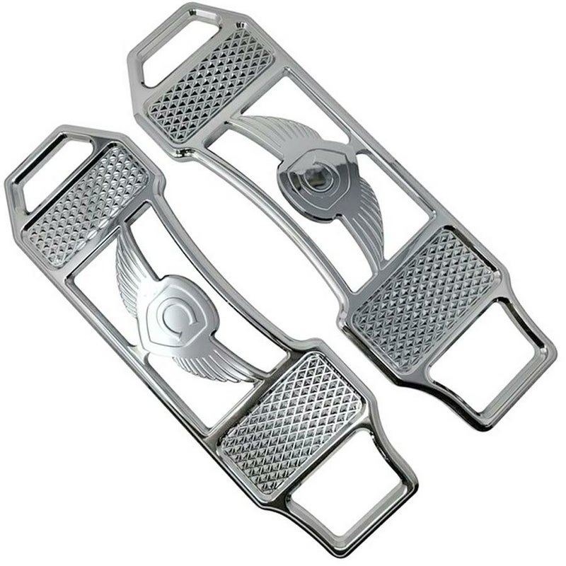 ハーレー ツーリング、FLソフテイル用 ライダーフロアボードセットです。 Covingtons(コビントン)のウィングロゴ入り。 デザインはダイヤガラガラヘビを模した、精緻なダイアモンドパターンがゴージャスな、Diamondback(ダイアモンドバック)デザイン。 取付け位置は好みに応じて1インチ(約5cm)の範囲で前後出来ます。 素材はビレットアルミニウム。CNCマシンによる削り出し加工品です。 左右ペア