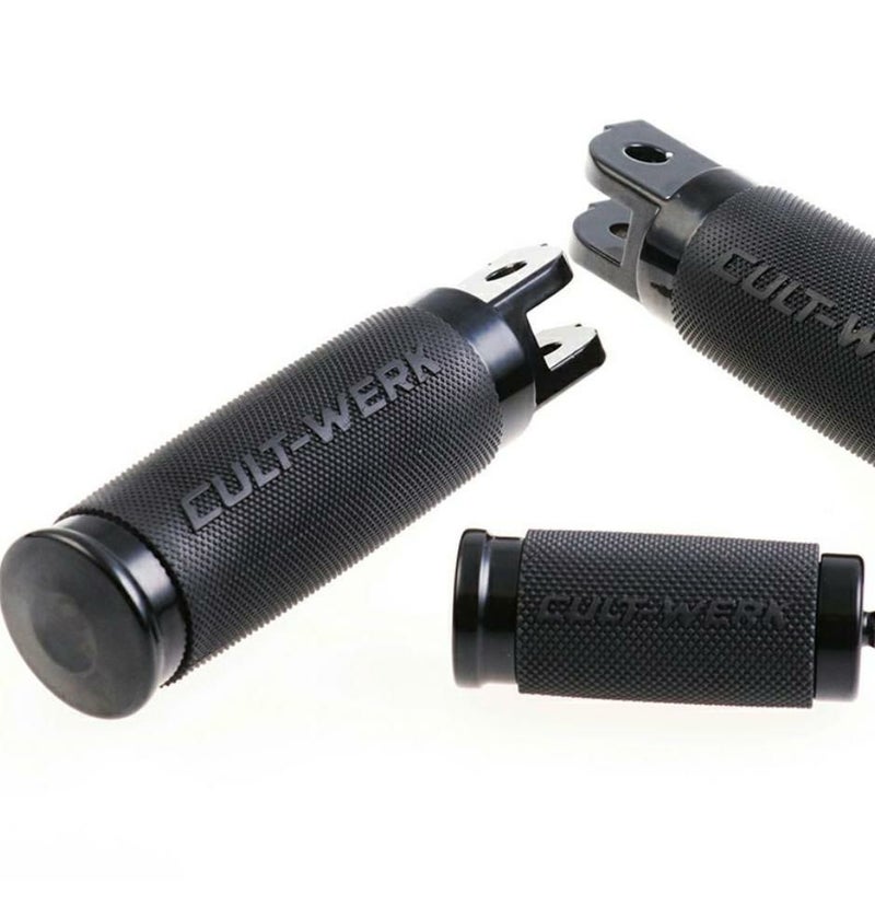 M8ソフテイルのライダーポジション用フットペグと、同デザインのシフトペグのセットです。 ブラックアウトされた、一見シンプルですが凝った造形のレーシーなデザインです。 本体はアルミ二ウム製。CNCマシンによる削り出し加工品です。 ブラックの滑り止めラバーの中央に、Cult Werkのロゴ入りです。 左右ペア