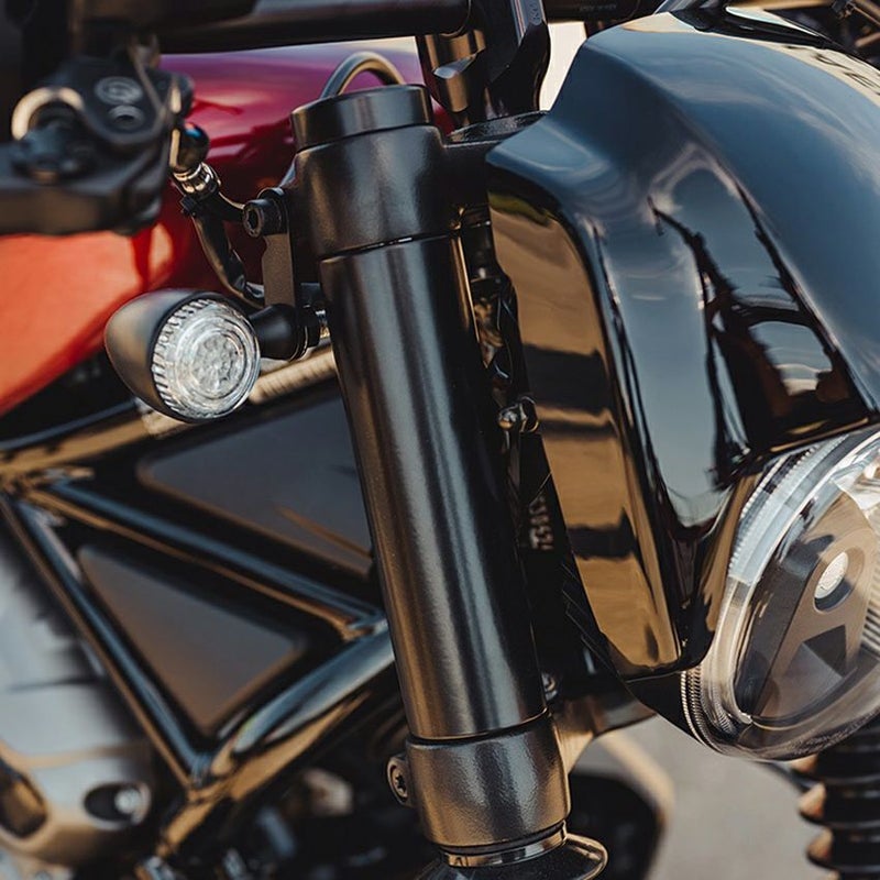ハーレー ナイトスター RH975用 フロントフォークカバーです。 フォークブラケット上下の間の部分をブラックアウトし、フォークを精悍にドレスアップします。 ※ノーマルのウィンカーステーを取り外した状態でフォークをカバーするよう、長めのサイズです。 ノーマルウィンカーステーをそのまま使用する場合、ショートサイズのセット(HD-NSR016)をお選びください。 アルミニウム製。5軸CNCマシンによる削り出し加工品です。 左右セット