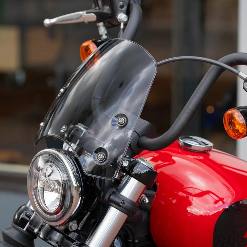 ソフテイル ブレイクアウト用 フライスクリーンです。 フロントフォークに装着します。ハンドルマウント式でないため、ハンドル形状に左右されません。 49mm径の正立フロントフォーク車用。 形状は先端に向けてテーパーする、すっきりとしたデザイン。 材質は丈夫な厚さ4mmのポリカーボネイト。 衝撃に強い自動車部品グレード。 傷防止のハードコート処理済みです。 ブラケットはスチール製。レーザーカットとCNCマシン曲げで製作されています。フィニッシュはテクスチャーブラック。 スクリーンとブラケットの接合部はエチレンプロピレンゴム製の防振グロメットを使用しています。 フォーククランプはグラスファイバー繊維入りの強化プラスチック素材。柔軟性に富んだエラストマー樹脂製のコレットと合わせ、しっかりとクランプ出来ます。 ※車両装着写真は他車種用のものです(参考写真)