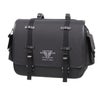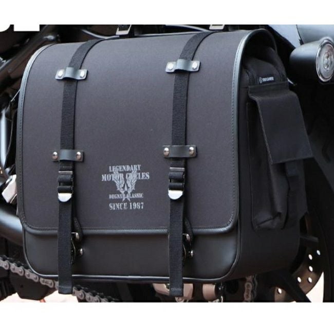 マフラー側対応のミリタリースタイルサドルバッグです。 - 容量は17Lとなっているので、2~3日のツーリング分のに荷物が収容可能です。 - サイドポケットをバッグの左右両側に装備しています。 - ダブルファスナーは片手で楽に開く事ができ、大きな開口部となっています。 - ポリエステル・PVC(合成皮革)となっており、専用レインカバーも付属しているので対候性も安心です。 - デグナー定番のクイックリリース金具は操作感はもちろん見た目にも美しい金具となっています。 - 付属品/専用レインカバー・バッグガード・取付ベルト(2本) ※3枚目以降は別カラー製品の参考画像になります。