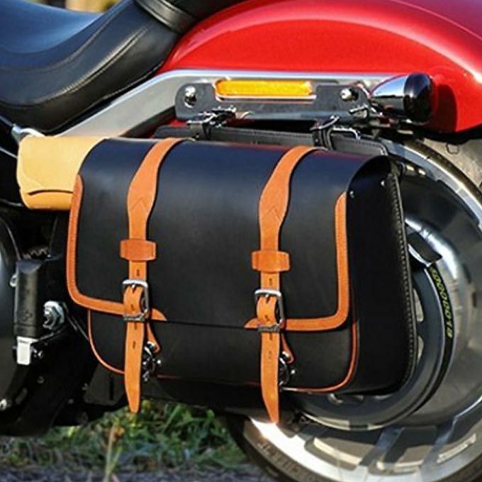 本革製サドルバッグです。 <特長> ●ブラックのベースと、ストラップ/トリムのキャメルブラウンのコントラストカラーの、質感の高いレザーバッグ ●キャメル部分はイタリア トスカーナ産の植物タンニンなめし・高級レザーを使用 ●バッグ底面は傾斜がついており、コーナリング時に擦れにくい形状です ●取付け用ストラップ x2本、レインカバーが付属します