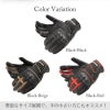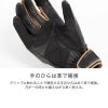 プロテクター付きのレザーグローブ。 ●自然なフィット感を生み出し操作性が向上する、フローティング構造のナックルプロテクターを装備。 ●人差し指、中指の関節部分にシャーリングを施し、指の曲げ伸ばしの抵抗を軽減しています。 ●手のひら側には摩耗しやすい部分に革をあてて補強してあり、耐久性に優れています。 ●手首部分は面ファスナー式で、着脱やサイズ調整が簡単にできます。 ●親指と人差し指にはタッチスクリーン対応素材を使用しており、スマホ等の操作が可能です。