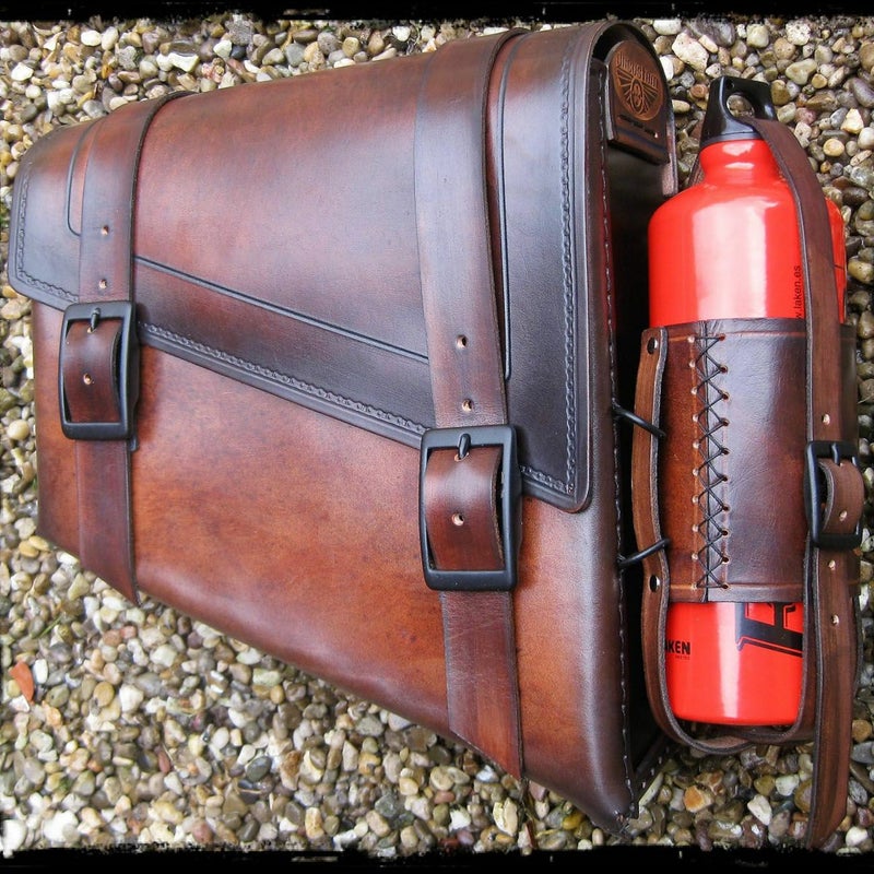 ハンドメイドの本革サドルバッグです。 スペインのクラフトマンの手作業で一品一品製作された、味わい深い製品です。 ボトルホルダーおよびフュエルボトルが付属します。 ブラウンのレザー。 昔ながらの堅苦しくないラフな雰囲気がボバーやチョッパーにも似合います。 バッグ本体は本革と、スチールのバックプレートの組み合わせです。 車両への取り付けは付属のタイラップ等でフレームやフェンダーレールへ固定します。 ※裏面の写真は別製品です。(参考写真) 正面向かって右側の縦が長い仕様(モデルA)と、左側の縦が長い仕様(モデルB)があります。装着車両、装着場所に合わせてお選びください。 このバッグは正面向かって右側縦が長い仕様(モデルA)です。 ※モデルA/B比較写真は別の製品です。(参考写真)
