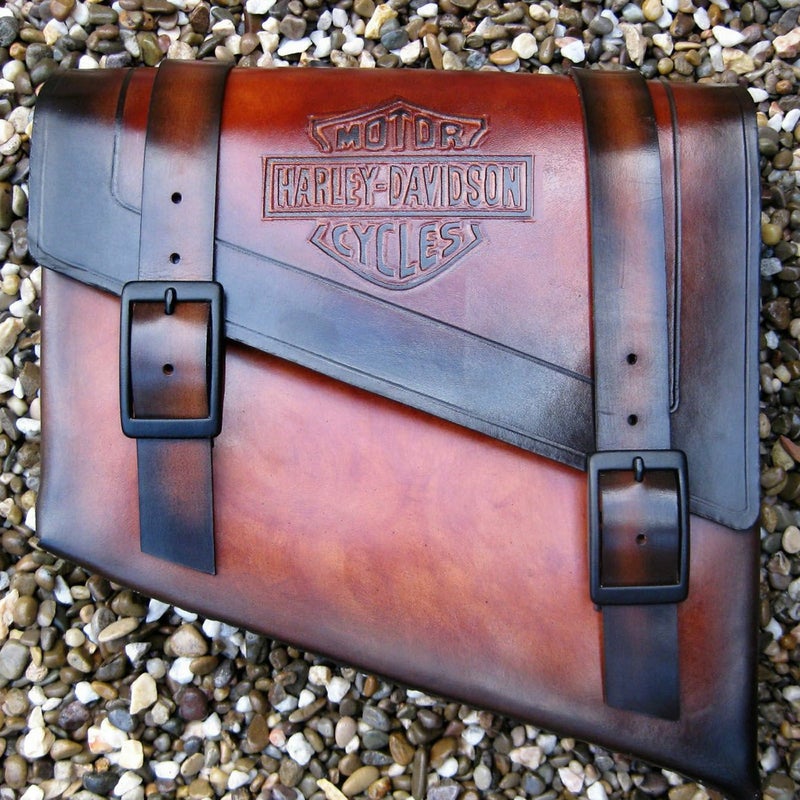 ハンドメイドの本革サドルバッグです。 スペインのクラフトマンの手作業で一品一品製作された、味わい深い製品です。 ブラウンのレザー。 リッドに大きく入ったハーレーロゴマークがデザインアクセント。 昔ながらの堅苦しくないラフな雰囲気がボバーやチョッパーにも似合います。 バッグ本体は本革と、スチールのバックプレートの組み合わせです。 車両への取り付けは付属のタイラップ等でフレームやフェンダーレールへ固定します。 ※裏面の写真は別製品です。(参考写真) 正面向かって右側の縦が長い仕様(モデルA)と、左側の縦が長い仕様(モデルB)があります。装着車両、装着場所に合わせてお選びください。 このバッグは正面向かって右側縦が長い仕様(モデルA)です。 ※モデルA/B比較写真は別の製品です。(参考写真)
