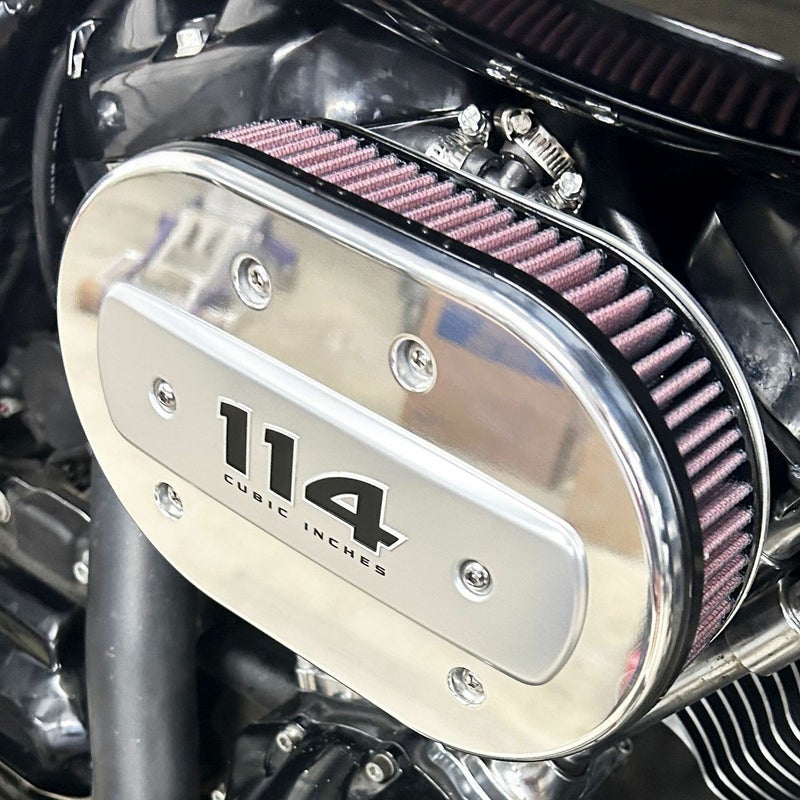 M8 ツーリング、ソフテイル、トライク用 ハイフローエアクリーナーです。 ステージ1対応。オーバルシェイプのK&N製ハイフローエアフィルターを使用しています。 汚れたら洗浄して繰り返し使えます。 トータルの厚さは2.5インチ(約6.4cm)の薄型プロファイル。 十分な吸入量を確保しつつ、すっきりとした見た目で足と干渉しません。 フェースカバーはビレットアルミニウム製、CMCマシン削り出し加工品です。 削り出しのアルミ地そのままの、マシンフィニッシュ。 メタルポリッシュで磨き上げればポリッシュ仕上げを楽しめます。 ※車両装着写真はポリッシュしたものです。(参考写真) フェースカバーにはM8モデル純正エアクリーナー用のメダリオンを装着出来ます。 (メダリオンは付属しません) ※ノーマルのサポートブラケット(16400049)を流用します。114ciエンジン搭載車等、純正オーバル型エアクリーナー装着車は別途必要となります。 ※ブリーザーボルト、ブリーザーキットは付属しません。DK Custom(DKカスタム)の別売ブリーザーキット、ブリーザーボルトをご使用ください。 ※組み立て時、ボルトには必ずネジロック(緩み止め剤)を使用してください。
